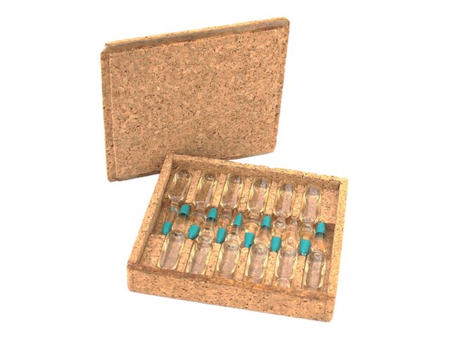Un dels primers dissenys en suro aglomerat de Productos del Corcho Aglomerado, és aquesta capsa per a dotze ampolletes injectables